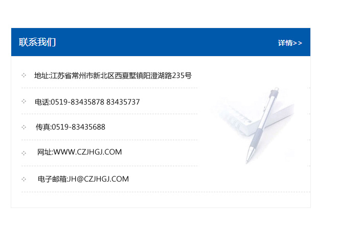 地址:常州市新北區友邦商務大廈1幢16、17層  電話:0519-85101652  傳真:0519-85112595  郵編:213022  網址:www.cz-jiayue_cn.usysfishing.com  郵箱:xiajifengaa@163.com